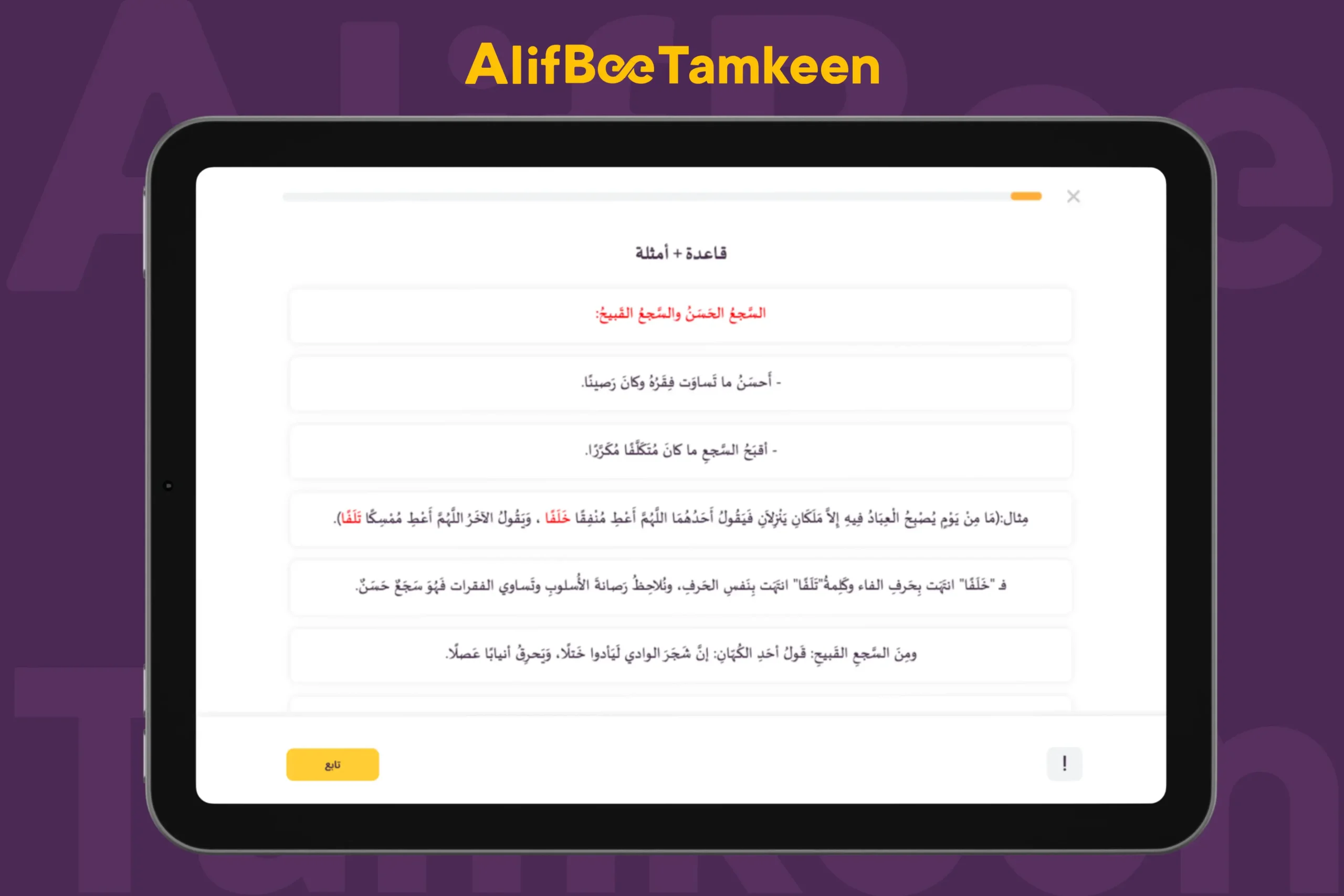 إنَّ إتقان السجع في البلاغة العربية لا يتحقق بمجرد حفظ تعريف السجع أو معرفة أنواعه، إنَّما يحتاج إلى تدريب عملي على قراءة النصوص البليغة وتحليلها، ثم محاولة الكتابة بأسلوب متوازن يجمع بين جمال الصوت وعمق المعنى، في تطبيق تمكين العربية من ألف بي، نؤمن أنَّ تعلُّم البلاغة لا ينبغي أن يكون نظريًّا جافًّا، إنَّما تجربةً حيّةً يتذوق فيها المتعلم جمال اللغة ويكتشف أسرارها؛ ولذلك نحرص في البرنامج التعليمي في تمكين على ما يأتي:
